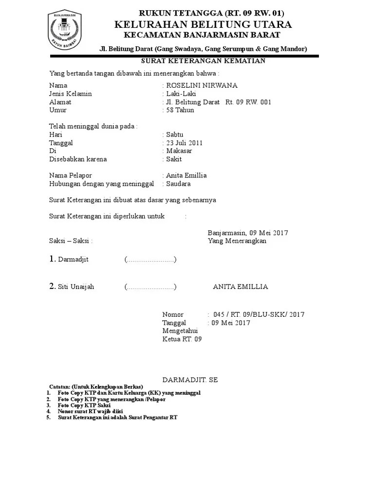 Demikian surat keterangan kematian ini kami buat untuk dapat dipergunakan sebagaimana mestinya. Melihat contoh surat kematian yang benar diperlukan bagi kamu yang hendak mengurus dokumen tersebut ke rt/rw, desa, hingga dukcapil . Mengurus rumah tangga alamat : Meminta surat pengantar dari rt dan rw. Contoh surat keterangan kematian dari rt. J e n a z a h.